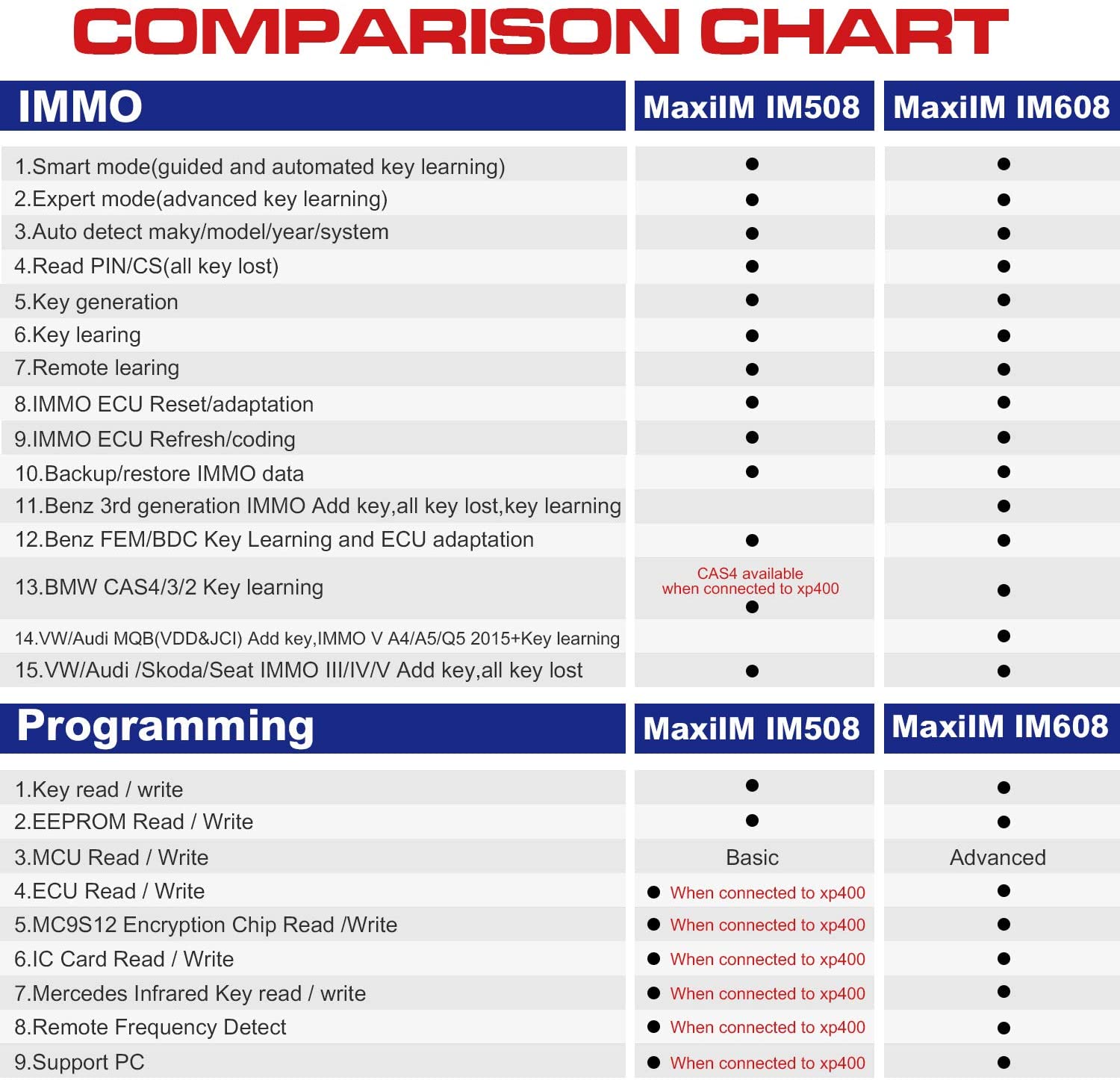 COMPREHENSIVE IMMO & KEY PROGRAMMING. IM508 can perform: Read PIN/CS(All Key Lost), key generation, key learning, remote learning on Benz FEM/BDC Key Learning/ECU Adaptation, BMW CAS3/2 Key Learning, VW/Audi/Skoda/Seat IMMO III/IV/V Add Key, All Key Lost, IMMO ECU reset/adaptation/refresh/coding, Transponder read & write, EEPROM/MCU read & write. IM508 is a professional automotive key programming tool that combines key programming, all car systems diagnosis and advanced service functions.
