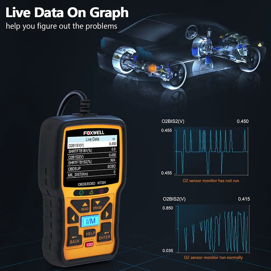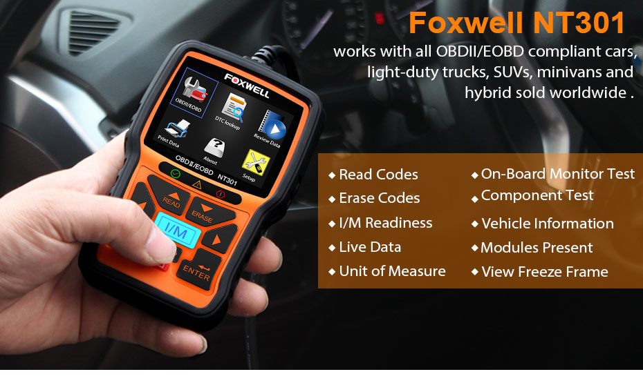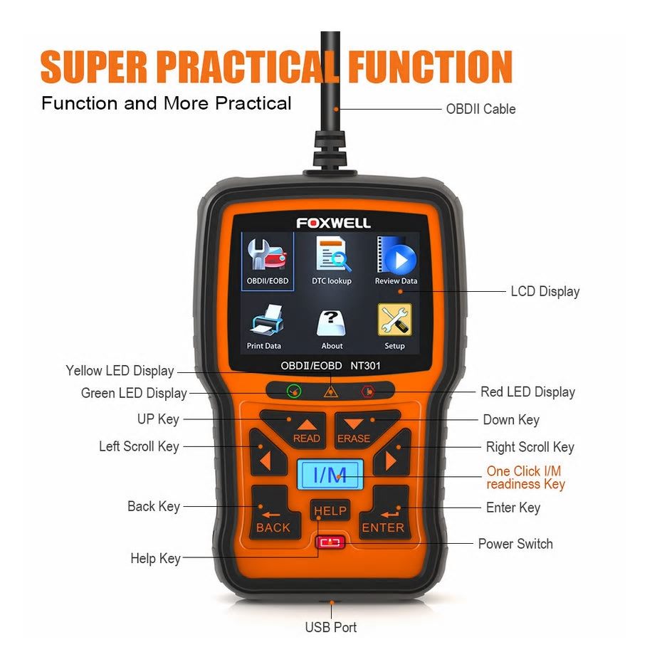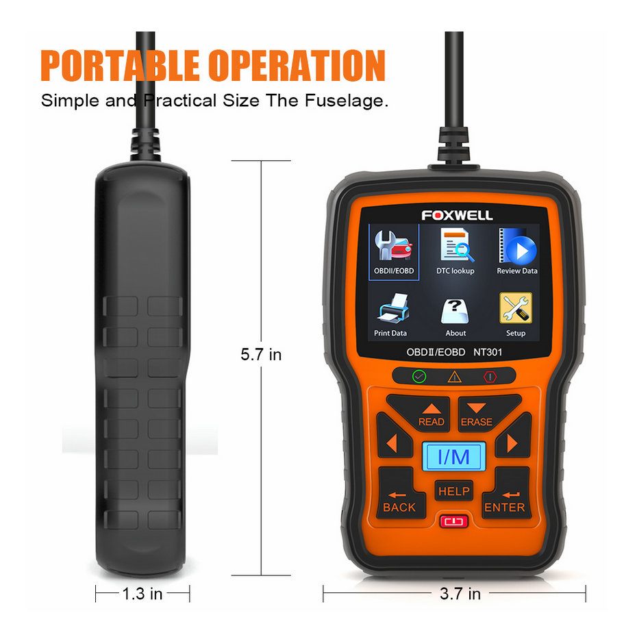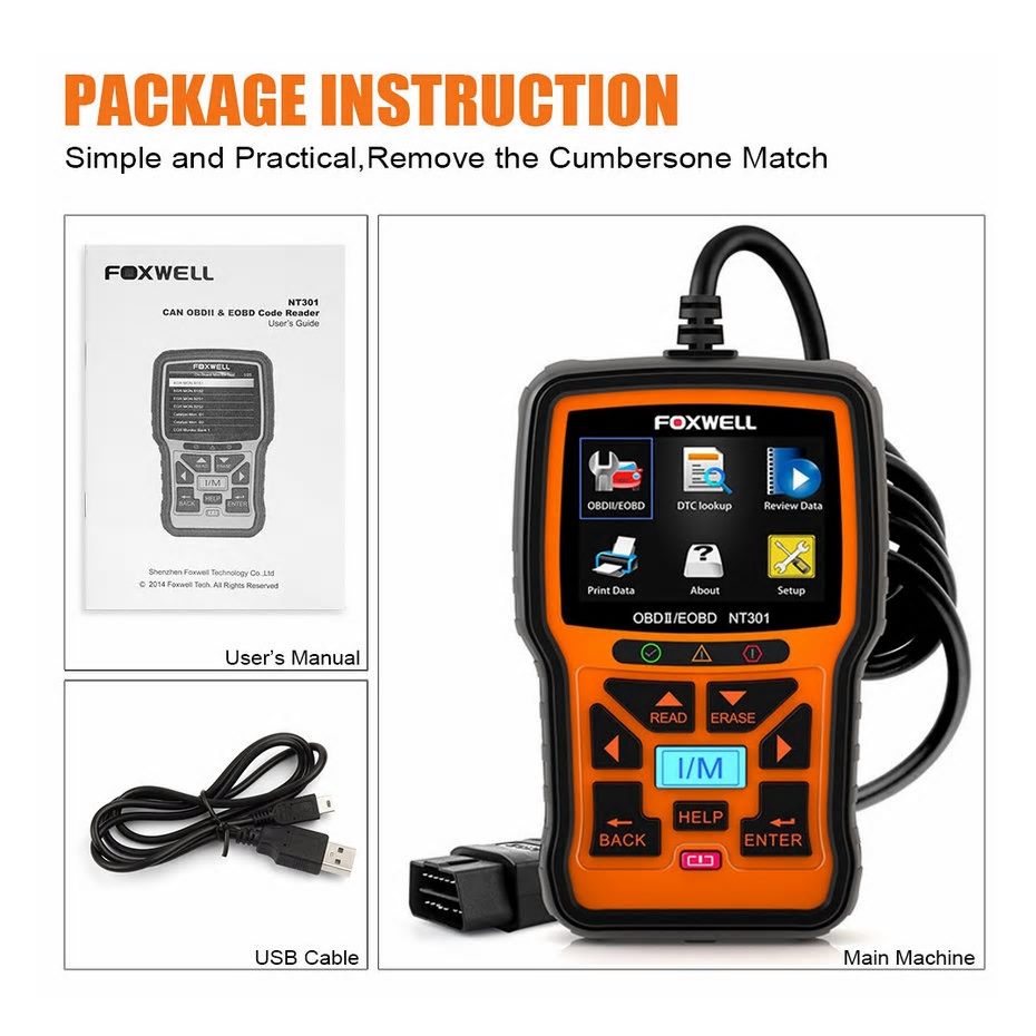 When it comes to diagnosing engine faults you can never go wrong with the new NT301 CAN OBD2/EOBD Code Reader from Foxwell. The NT301 offers a wealth of information for the professional mechanic right through to the DIYer which ensures that OBD2/EOBD faults on today's vehicles can quickly and efficiently be eliminated. The NT301 OBD2 scanner enables you to read DTCs, locate bad O2 sensors, access to emissions readiness status, turn off CEL(check engine light) or MIL, reset monitor, read live data and retrieve VIN of your vehicle.