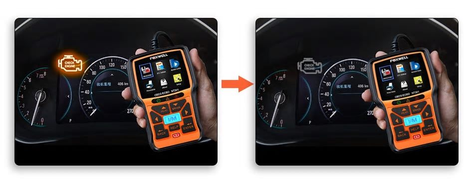 - Clears codes, turns off Check Engine Light (MIL) and resets monitors