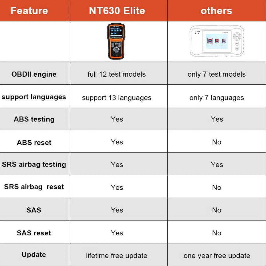 Compared to other car airbags diagnostic tool, Foxwell NT630 Elite can not only read and clear airbag fault codes, it allows you to reset the airbag control module after airbag replacement. This NT630 Elite scanner is just the perfect abs/airbag diagnostic tool for car owners that can't wait to have.