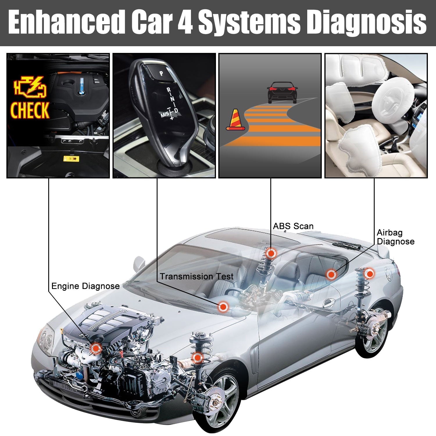 ENHANCED 4 SYSTEMS DIAGNOSIS - Not only diagnose the engine system but also performs full detection on vehicle's other 3 main ECU systems (Transmission, ABS, Airbag(SRS)). Reads & erases fault codes, turns off warning lights, and reads live PCM datastream on these 4 systems.