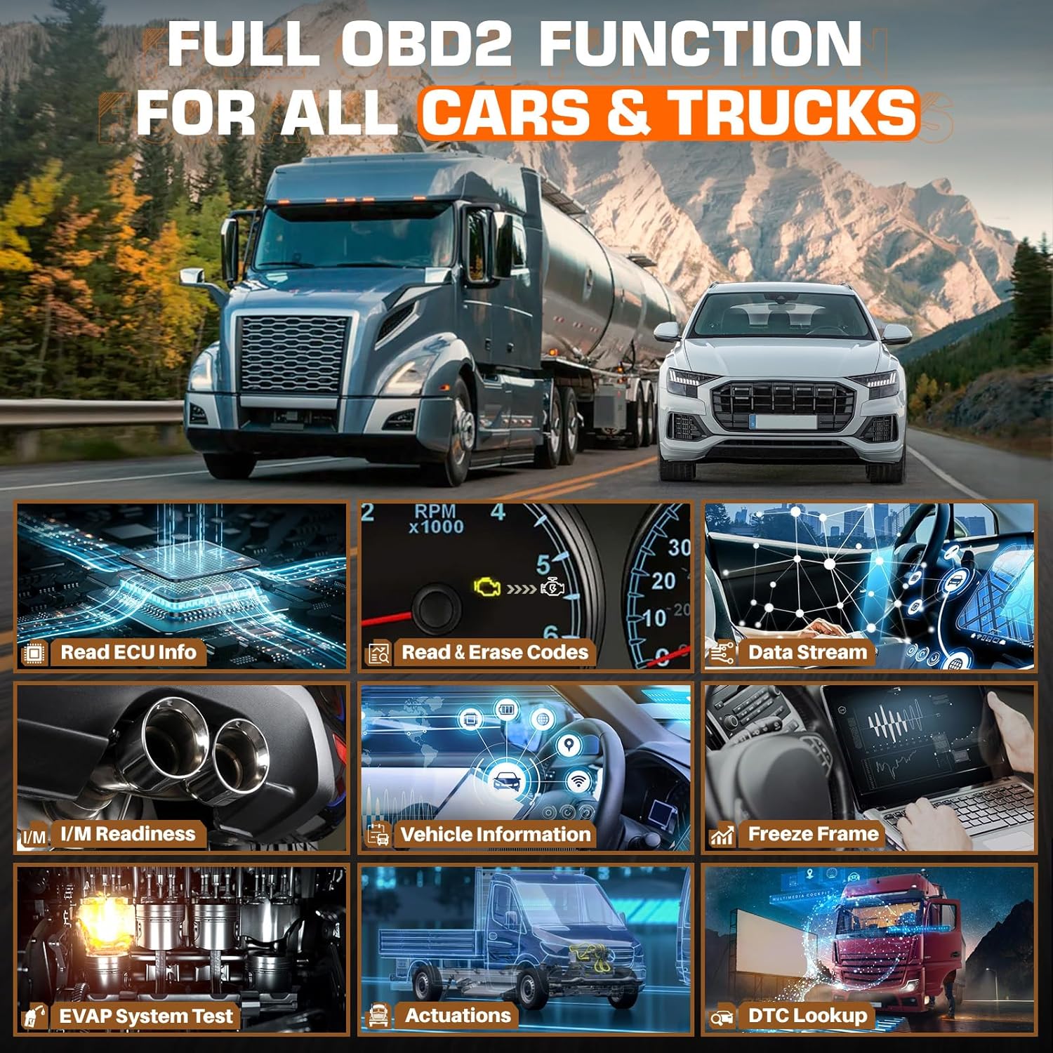 Designed for 12V & 24V semi trucks, pickup trucks, heavy-duty trucks, and 99% of commercial vehicles, the ANCEL V5 HD obd2 scanner supports 80+ vehicle brands including CUMMINS, CATERPILLAR, FREIGHTLINER, HALDEX, JMC, JOHN DEERE, NAVISTAR, PACCAR, BOBCAT, TEREX, WABASH, WABCO, FOTON, MACK, DETROIT, ENGINES, ALLISON, MAXXFORCE, JOHN DEERE, KENWORTH, INTERNATIONAL, BREMACH, VOLVO, IVECO, DAF, MAN, RENAULT, SCANIA, ASTRA, BOSCH, ISUZU, HINO, FUSO, ATLAS, BENDIX, DELPHI, EATON, etc.