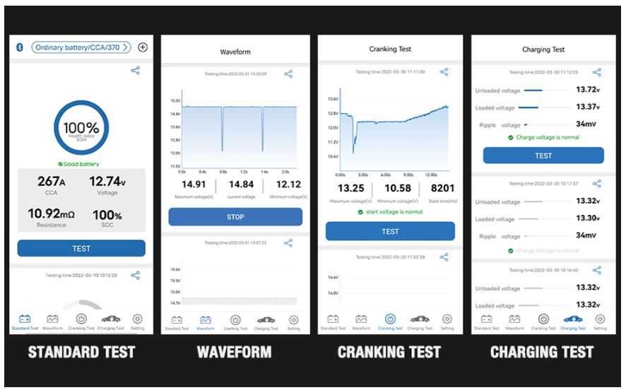 BLUETOOTH 5.0 CAR BATTERY TESTER Compatible with all IOS and Android system cellphones and tablets. BK100 can test all 6V 12V 100-2000CCA batteries including regular flooded, AGM flat plate, AGM spiral, or GEL batteries. Provides overall analysis of batteries’ health and helps you know its status in advanced before it dies. BK100 battery tester supports cranking and charging system test also alternator and starter test.